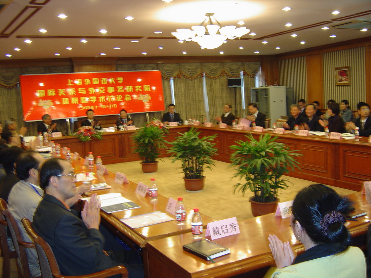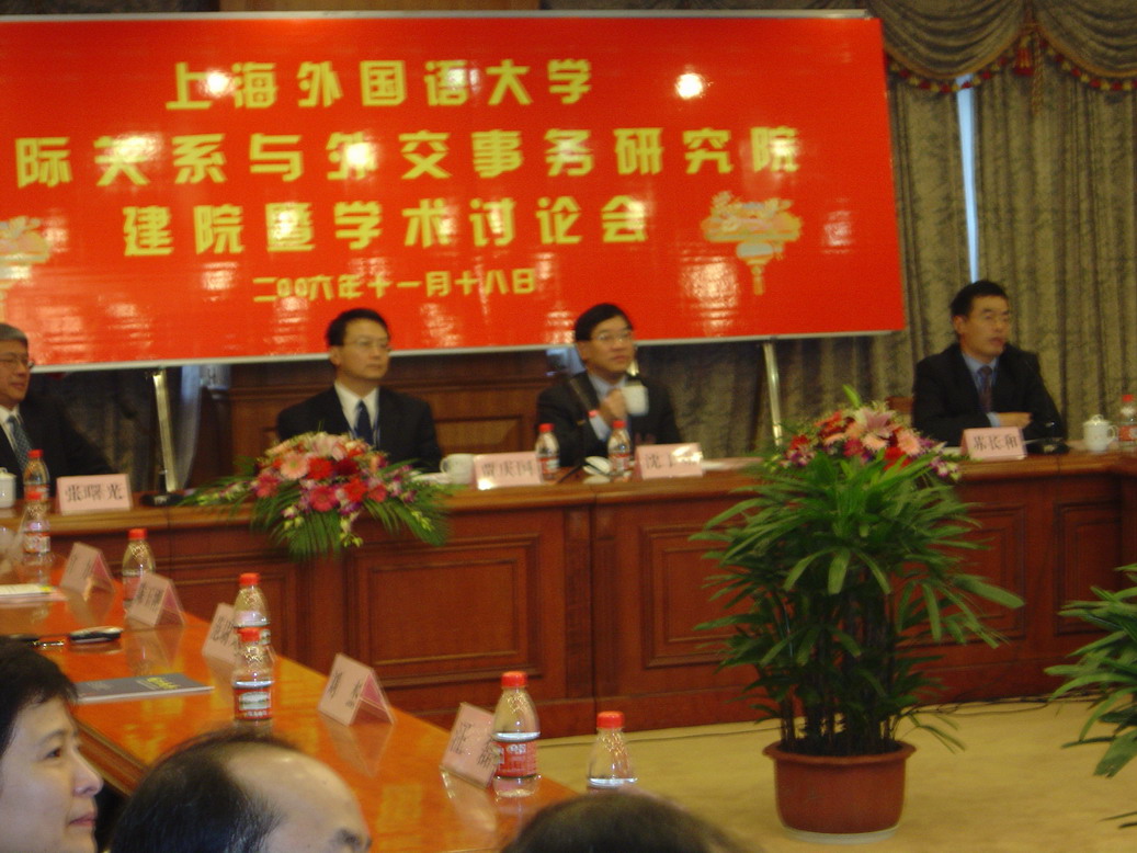 上海外国语大学“国际关系与外交事务研究院”(简称“国关院”)成立揭牌仪式于2006年11月18日上午9:00在上外会议中心英伦厅隆重举行。来自北京大学、中共中央党校、中国政法大学、北京外国语大学;复旦大学、上海交通大学、华东师范大学、上海社会科学院、上海国际问题研究所、同济大学、上海人民出版社、上海市国际关系学会的近50名嘉宾和学界代表参加了本次成立庆典大会。除上述单位以外,清华大学、中国社科院等单位也纷纷发来贺电,对国关院的成立表示热烈的祝贺。来自我校相关机构和兄弟院系的同志也出席了本次大会。北京大学国际关系学院副院长贾庆国、复旦大学国际问题研究院常务副院长沈丁立分别代表北方和南方的国际关系学界对上外国关院的成立发表了热情洋溢的祝贺词。倪世雄教授、俞正梁教授、金应忠教授等也发表了恳切动人的致辞。