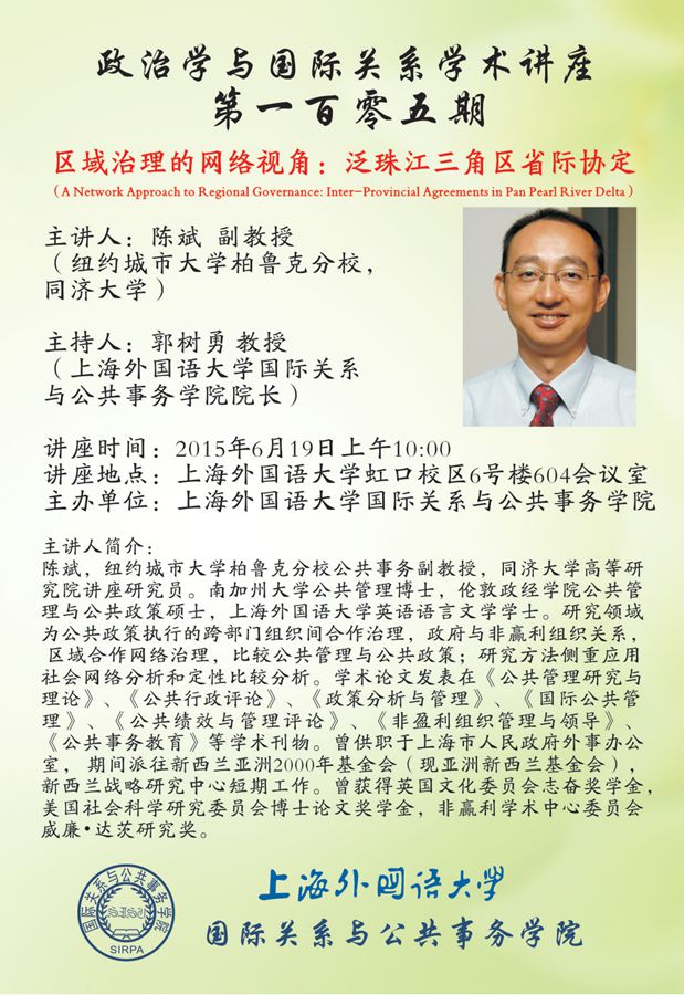 报告题目:区域治理的网络视角:泛珠江三角区省际协定(A NetworkApproach to Regional Governance: Inter-Provincial Agreements in Pan Pearl RiverDelta)