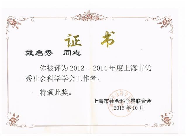 戴启秀教授被评为“2012-2014年度上海市优秀社会科学工作者”称号