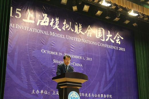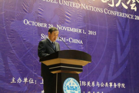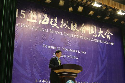 2015上海模拟联合国大会于2015年10月29日在上海外国语大学松江校区教育会堂隆重开幕,上海市政协常委、对外友好委员会主任道书明,市政协对外友好委员会专职副主任孙小双、上海市人民代表大会外事委员会办公室副主任罗杰、雷竞技官方入口院长郭树勇教授、上外团委副书记田昊罡及国关学院各年级辅导员等出席了大会开幕式。