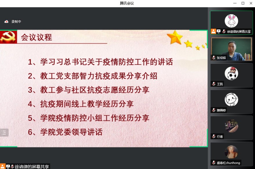 教工第二党支部书记徐谙律主持了此次活动,院党委领导、教工第一、第二支部党员围绕抗疫主题,分别从政治学习、科研、教学和社区与校内的抗疫服务等方面分享了近期疫情防控期间的工作经历与经验。