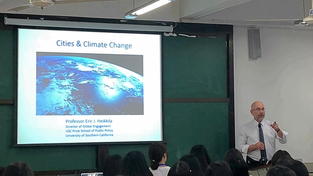 来自美国南加州大学公共事务学院的埃里克·J·海基拉(Eric J. Heikkila)教授围绕“何为气候变化、如何减缓气候变化、如何应对气候变化、城市的角色”话题展开。埃里克·J·海基拉教授认为,人类的活动造成了温室气体排放从而导致剧烈的气候变化,工业革命以来,欧美等发达国家位居温室气体排放量榜首,值得关注的是,近年来以中国和印度为代表新兴国家经济体的工业化进程和碳排放量也在逐年增长。他指出,亚洲是最脆弱也是受气候变暖影响最大的区域,气候变化主要是以科学为基础的,但也不可能脱离政治而存在,政策应该尽量基于科学事实,产生的一切后果也需要人类共同承担,因此认为控制温室气体排放问题主要有两项机制,一种是碳税,一种是总量管制和交易体系。埃里克·J·海基拉教授更偏爱更具有自主决定权和非强硬手段干预的 “碳税”机制。关于城市在全球治理所扮演的角色的问题,埃里克·J·海基拉教授认为随着大量人口集聚于城市、城市化不断发展,城市在制定政策方面尤其是阐明议程方面产生了重要的影响。