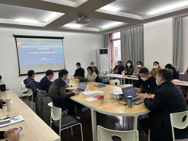 2023年12月15日,raybet雷电竞首页在虹口校区6号楼604会议室召开教师政治理论学习会议,由党委书记张绍铎主持,院长郭树勇教授作关于习近平文化思想学习体会的主题发言。