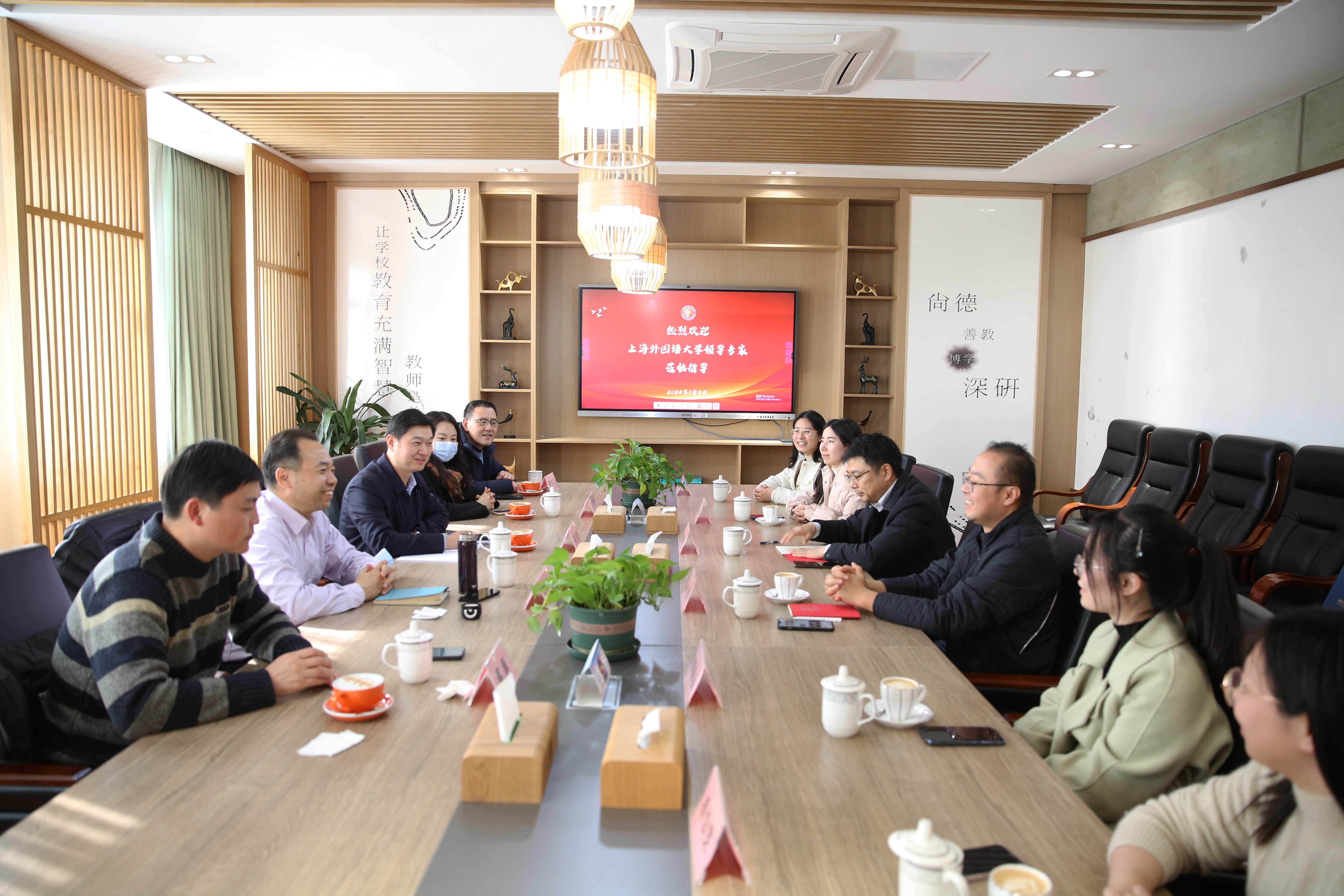 1月3日下午,国关学院党委书记张绍铎、国关学院党委副书记蒋灏、辅导员任童走访上海金山中学,并围绕“高中--大学外交人才接续培养暨育苗工程”、职业生涯规划、大学生实习基地、在职教师专业发展项目座谈会等开展深入交流。上外中国外语教材与教法研究中心、上海外教社教育培训中心副主任、金山区教育局挂职副局长陈先奎,金山中学党总支书记胡建明,党总支副书记、校长金弢,上外毕业教师代表樊学义、潘怡雯、金晶、谭婉心、刘玉玲出席会议。
